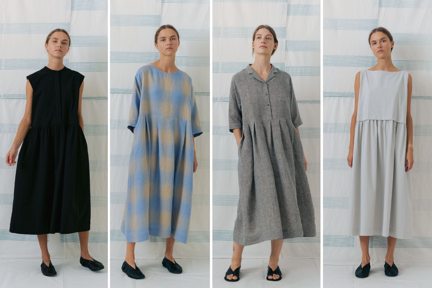 スッキリ上品に着られる「バンドカラードレス(全3色)」、mukuといえば!の「プリーツドレス(全4色)」、おとなに似合う工夫満載の「開襟ドレス(全3色)」、夏を涼やかに過ごせる「ノースリーブドレス(全5色)」。正直どれも素敵で選べません!(笑)