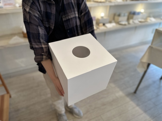 このボックスの中に石鹸がたくさん入っています。お店で税込み1100円以上のお買い物をしてくれた方につかみどり1回チャンス!掴んで取り出した分だけお持ち帰りいただけますよ!