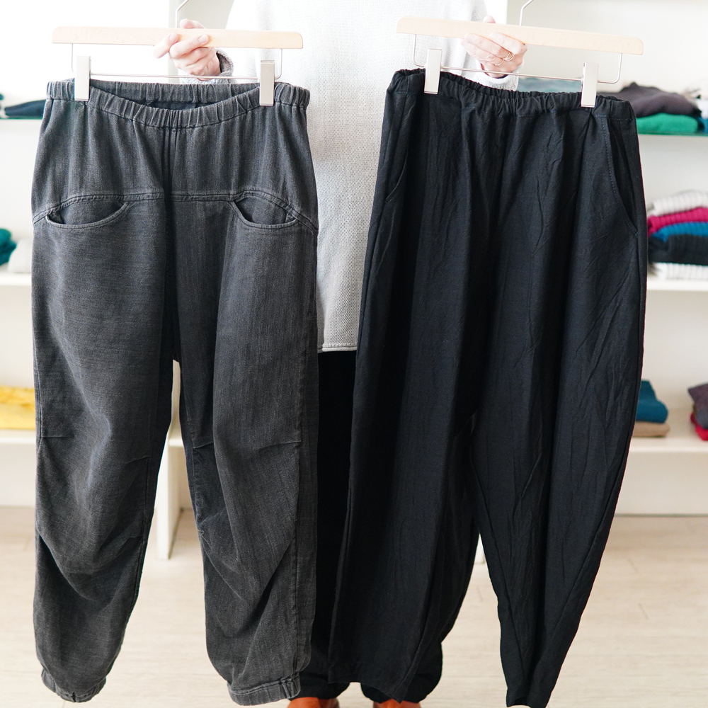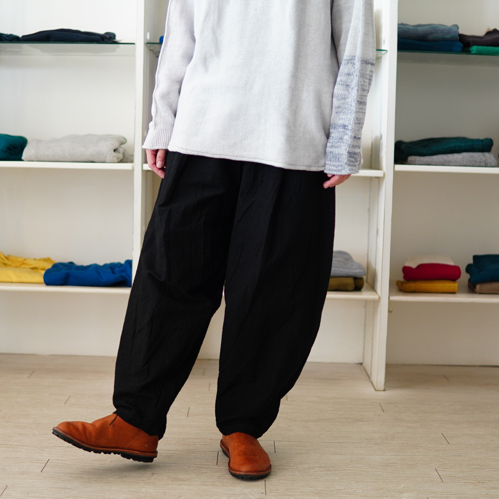 コットン素材のボンズは、以前の企画展でもご紹介しましたが、この度デニム生地が登場!デニムと言っても軽くてやわらかなブラックデニムなので、とっても履きやすいですよ。