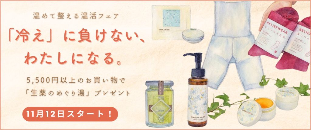 期間中、お店とオンラインショップで「温活フェア対象商品」いずれかを含めて5500円(税込)以上お買物をされた方に、生薬のめぐり湯を1包プレゼント!