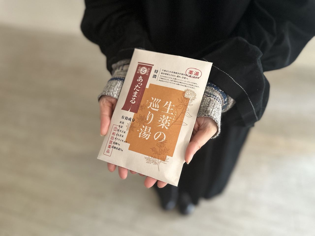 フェアのプレゼントとしてご用意した、生薬のめぐり湯も毎年人気の入浴剤です。生薬の有効成分が血行を促進することでからだのめぐりを整え、滞りもリセットしてくれます。お風呂から出た後もポカポカが続き、スムーズな眠りへと導いてくれるので、寒さが厳しい日や身体が冷えきった日にオススメです。フェア中はお試ししやすい5包入りタイプの販売をいたします。
