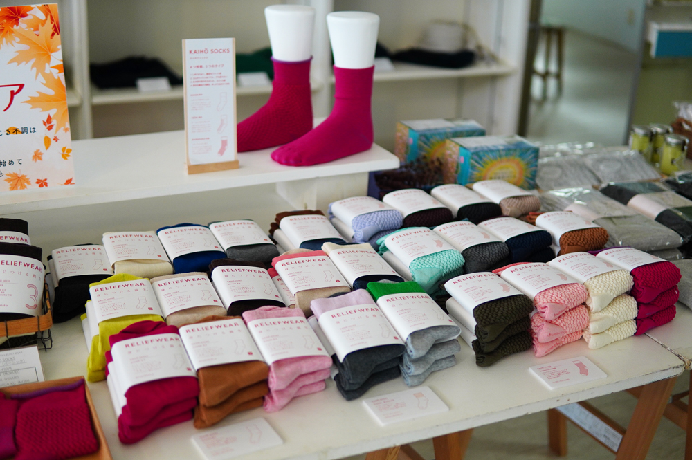 お店でパッと目に入るのが、色とりどりの「RELIEFWEAR」の靴下。今年新たに温活フェアの対象商品に加わった「KAIHO SOCKS」は、身体を「しめつけない」こと、「温める」ことを考えて作られた靴下です。お店スタッフも愛用しているRELIEFWEARの靴下について、今日はたっぷりご紹介させていただきます。