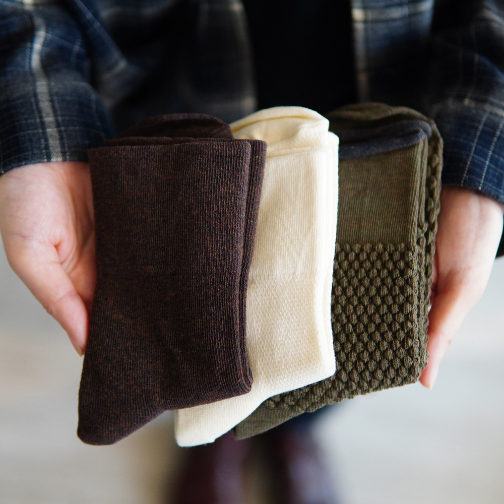 ちなみに私は、ベーシックのセットを買い足しました。秋冬用にKIHONのMOKUEI(ダークブラウン)が欲しい!と思っていたのと、TSUKIのHIKARI(オフホワイト)は既に持っていてヘビロテしているので、買い替えに。SHINSHUKUのMORI(ディープグリーン)はRELIEFWEARさんでも人気カラーということで、間違いない3色は絶対使いやすい!と今回のお買物リスト入り!実際に履いてみると、MORI(ディープグリーン)がすごく良い色でお気に入りになりました。人気カラーというのが納得…。MORIは単品での販売もございます。