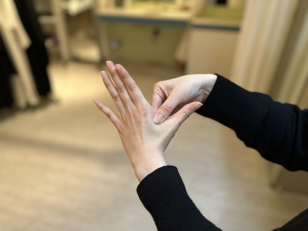 【押し方】手の甲を上にして、もう片方の親指でぐっと3秒~5秒ほど押して離すのを繰り返します。