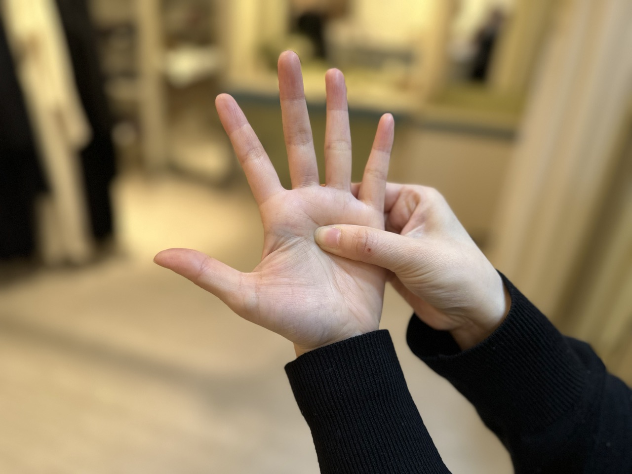 【場所】「谷の合間」を意味する合谷。手の甲側の、親指と人差し指のつけ根にあるへこみ部分。