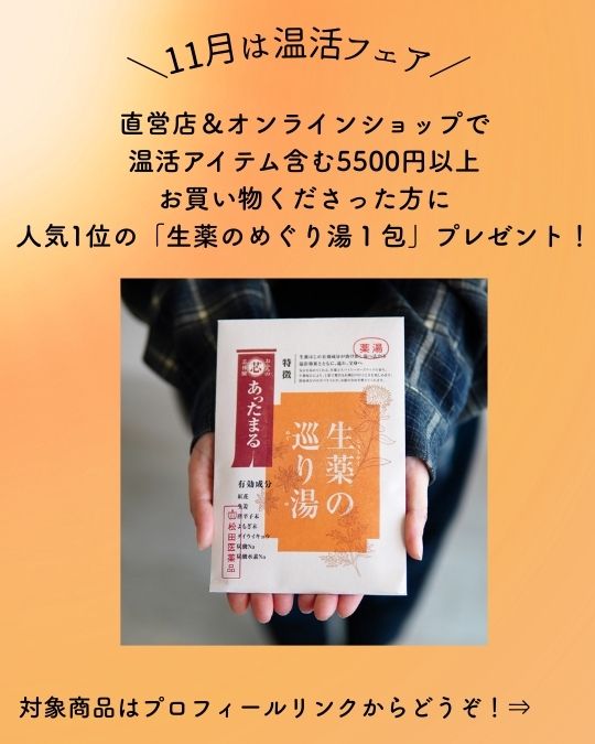 温活アイテムは、この冬引き続きオンラインショップとお店で販売する予定ですが、12月1日11時までにご注文いただくと、人気No.1の「生薬のめぐり湯」をプレゼントさせていただいています。