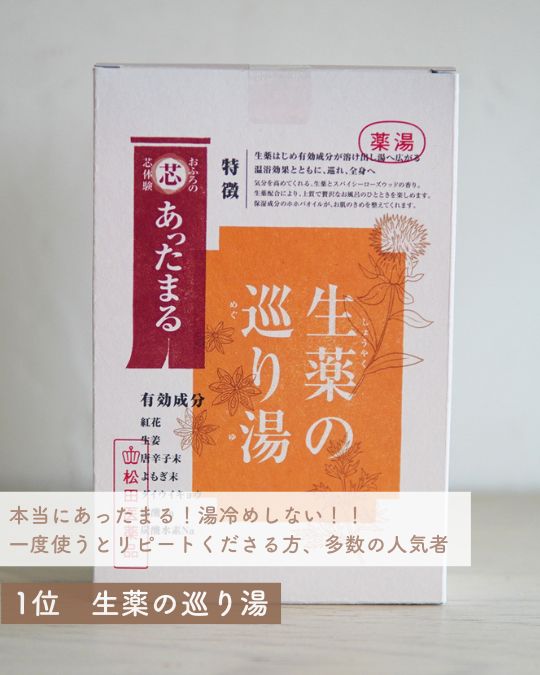 人気第1位は、生薬のめぐり湯。体を温める生薬に加え、保湿をしてくれるホホバオイルが入っているので、からだはポカポカしっとり。一度使うとやみつきになる入浴剤なのです。