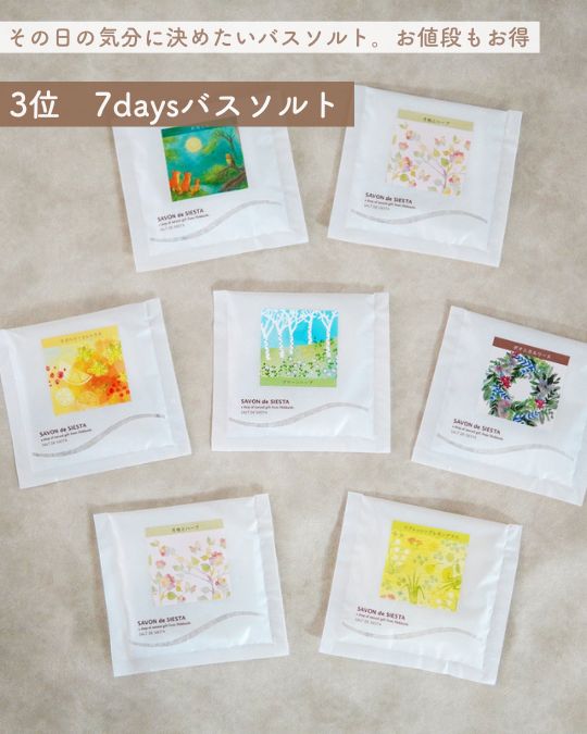 第3位は、私達SAVON de SIESTAの「7days バスソルト」。ランクインがとても嬉しいです!死海の塩のバスソルトは体をあたため、そして乾燥から守ってくれます。そして天然のアロマの香りがふわっと広がり、気持ちも癒してくれます。香りの異なるバスソルトが入っているので、その日の直感で選んでくださいね。
