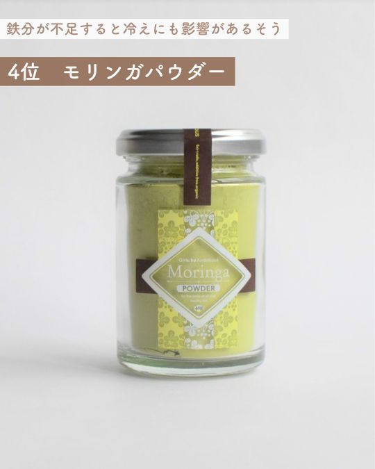 第4位は、インナーケアできるモリンガパウダー。お湯に溶かしてさっと飲める手軽さと、鉄分がたっぷり入っていることが、貧血気味の方に人気です。鉄分が不足すると冷えにも影響するそう。しっかりと内側から体を整えたいですね。