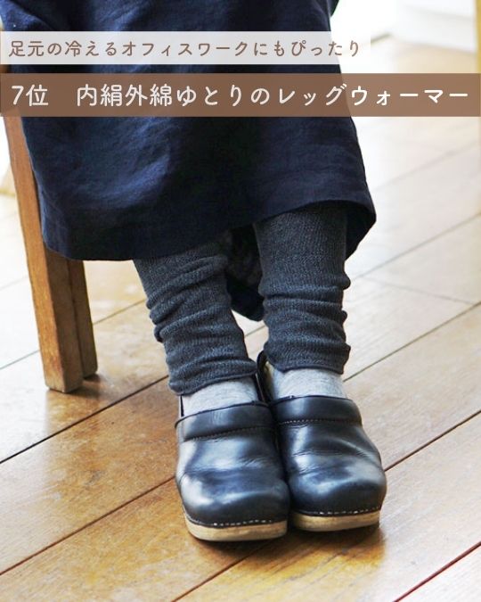 7位はゆとりのレッグウォーマー。素肌につけても気持ちいいのはもちろん、ゆったりとしたつくりなのアで、靴下やタイツの上からもつけられます。オフィスに置いておくと、デスク仕事の冷えが楽になるので本当におすすめですよ!!こちらもチャコールが完売してしまったのですが、おやすみソックス同様、予約販売を行っています。
