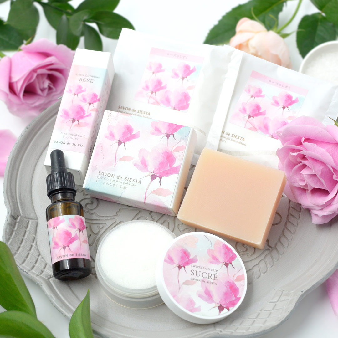 ローズの優雅な香りに包まれながら、日々の疲れをそっと解きほぐすスキンケアタイムへと導きます。