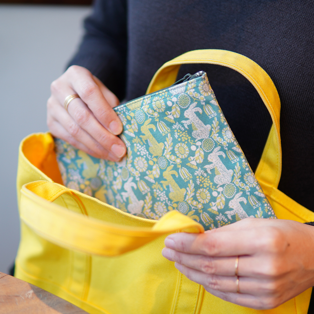 こだわりは、裏地の色。表地とは正反対のパキッした明るい色を持ってくるのが絶対にかわいい!と思ったので、明るいイエローを選びました。ファスナーを開けるたびに、ふふふ♪とうれしい気持ちが溢れます。