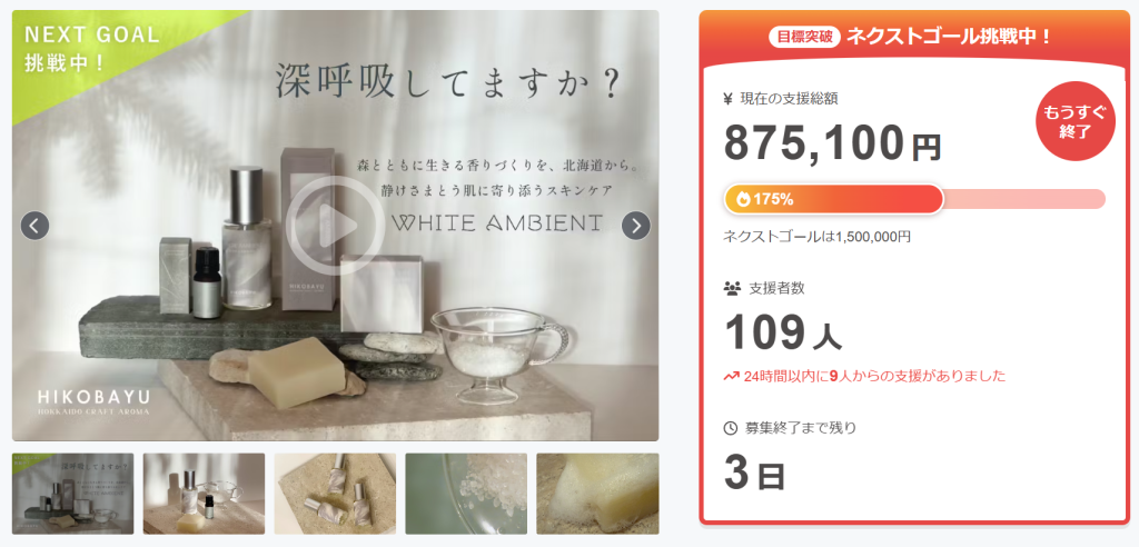 単品だけでなく、White Ambientシリーズのセットや、Hikobayuさんのブレンド製油、森林サウナ体験など、とても魅力的なリターンが揃っていますので、ぜひ一度、クラファンのページをご覧ください。