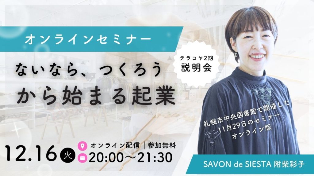 また、『シエスタのテラコヤ2期』についてもっと知りたいという方のために、12月16日(火)20時から、SAVON de SIESTAの附柴彩子による、オンラインセミナー&テラコヤ説明会を開催します。