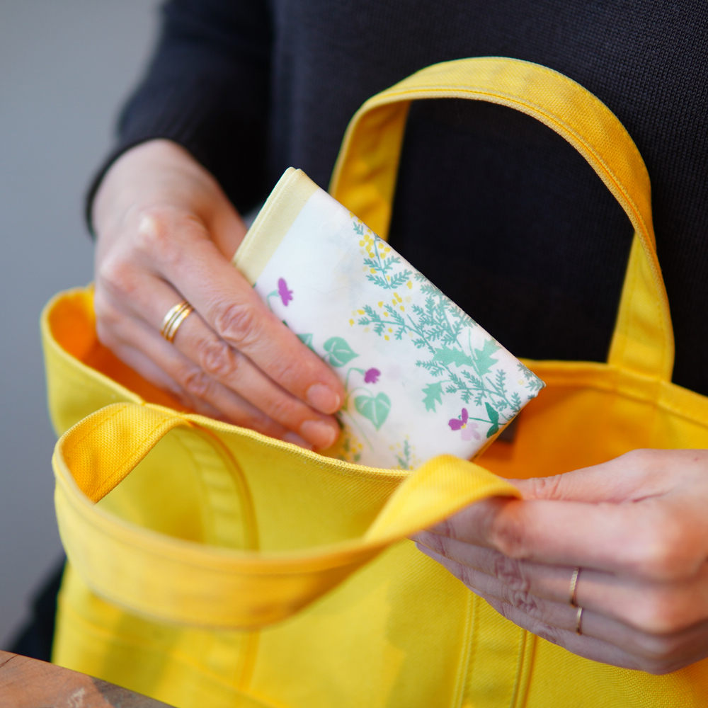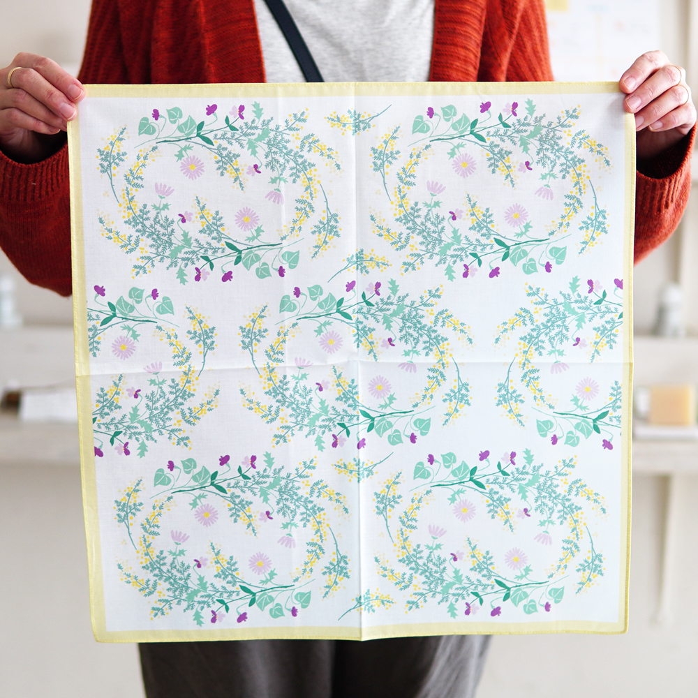 可憐な草花がリース状になっているデザインもかわいいのですが、注目していただきたいもうひとつのポイントは、黄色い四角の枠。これがあることでデザイン全体がしまり、全体のバランスがぐっと良くなっているんです。46㎝角のちょっと大きめハンカチなので、小ぶりのスカーフとしても使ってもOK!シンプルなTシャツに合わせて軽やかな気持ちでおでかけしたくなります。