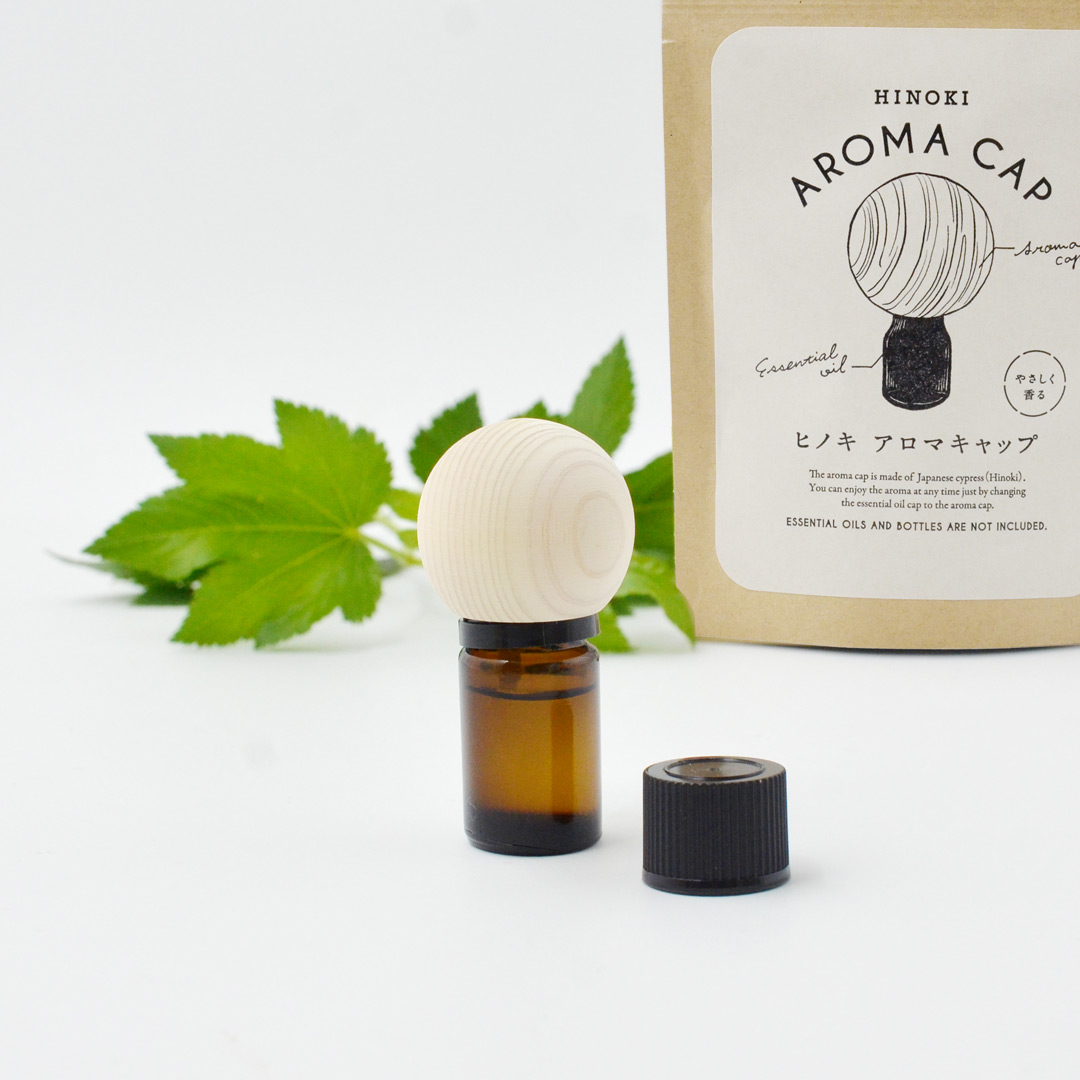 ブレンド精油のボトルキャップを付け替えるだけで香りが楽しめる「アロマキャップ」。