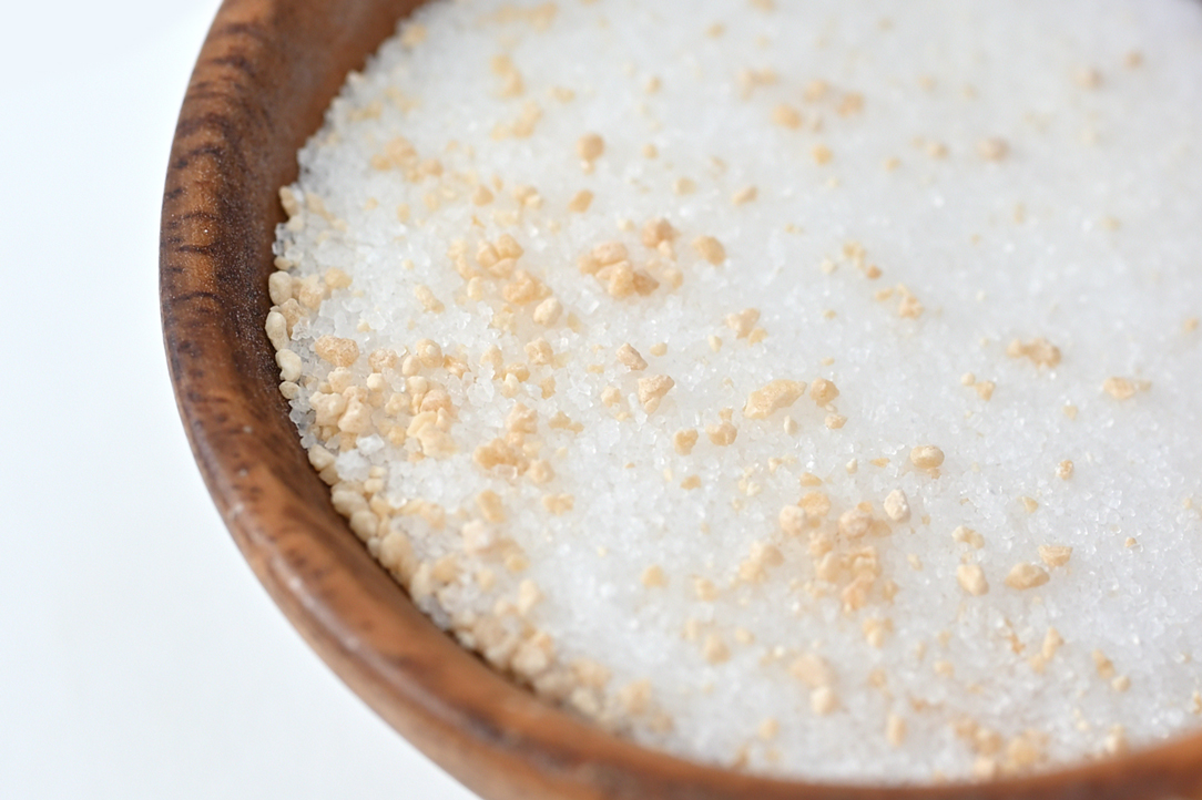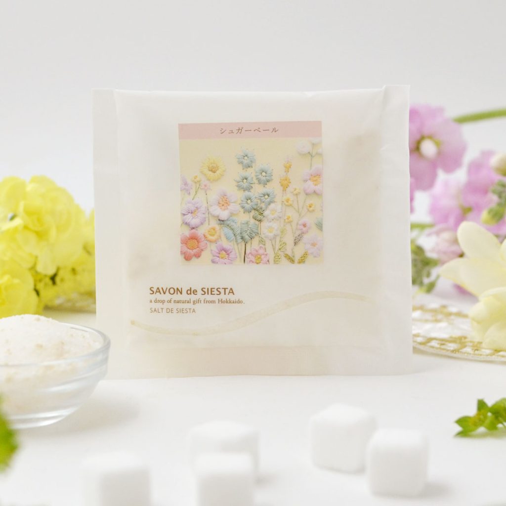 温泉由来成分の硫酸ナトリウム、シアバター、北海道産のお砂糖でできたバスシュガーです。お風呂にサッと入れていただくと、お湯がやわらかく、湯上がりの肌はしっとり。