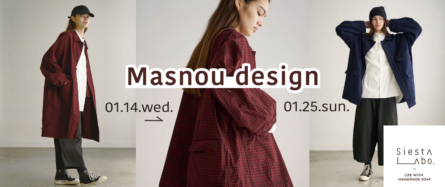 また、マスノウデザインのプレス・杉山育子さんも1月17日(土)、18日(日)在店くださいます。どんなふうに着ると素敵か、ほがらかな笑顔とともに教えてくださいます。お洋服のお話はもちろん、おしゃべりも楽しみに、ぜひお越しください。