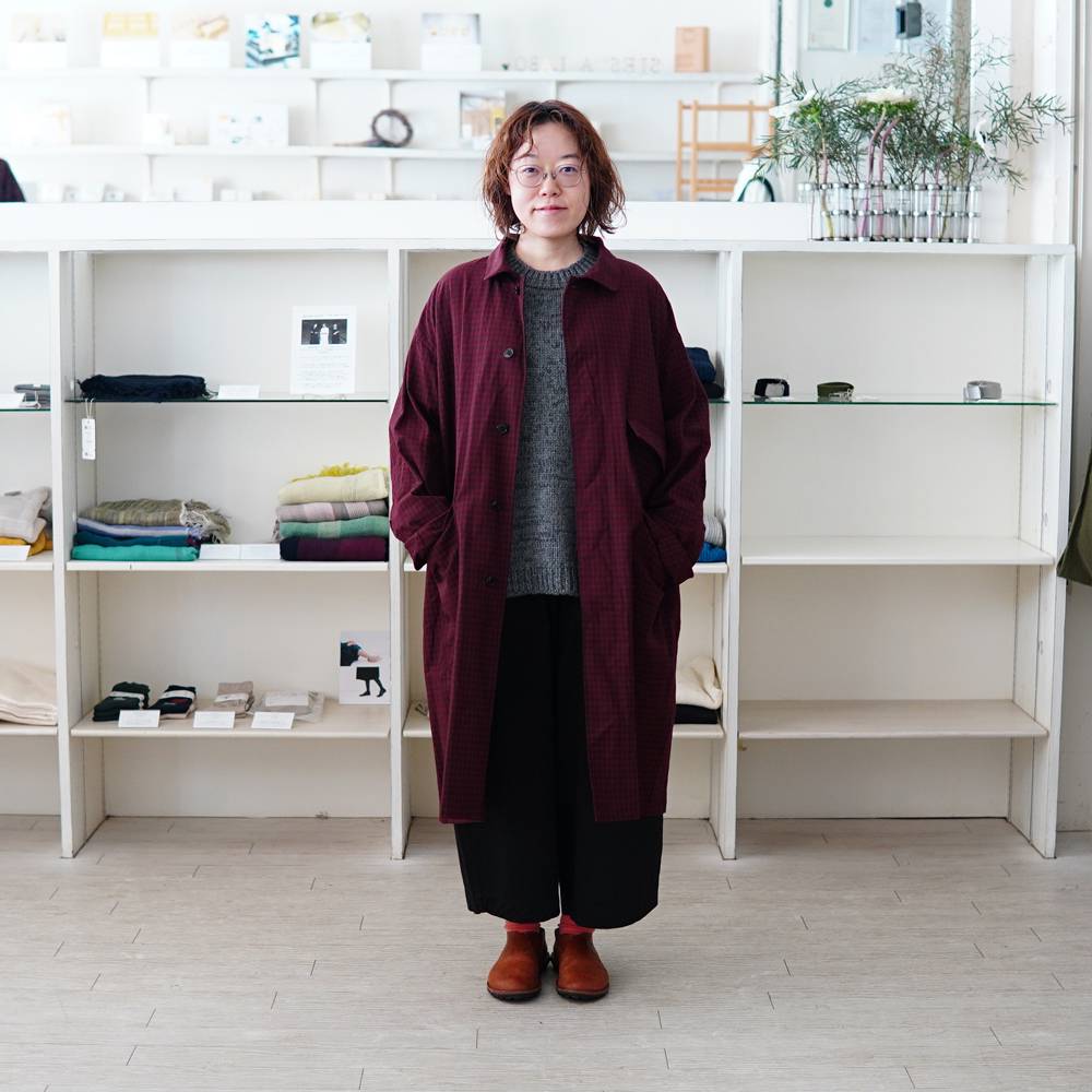 落ち着いたボルドーはモノトーンにも明るい色味でも合わせやすく溶け込みやすい。これまでシエスタでご紹介しているお洋服との相性も抜群ですよ。