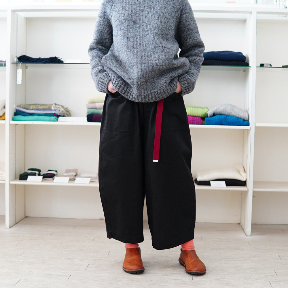 幅広なパンツなので、動きやすくてとっても楽!そして軽い!コットン100%なのでおうちでじゃぶじゃぶお洗濯もできます。たくさん着てたくさん洗うほどどんどんなじんで着やすくなるという育て甲斐のある1枚です(マスノウデザインといえば育てる系のお洋服が多いんですよ)。