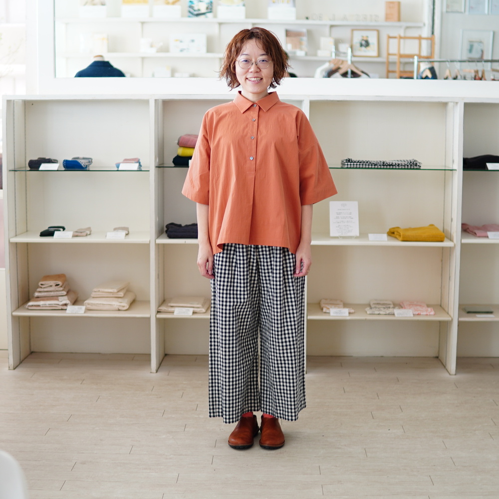 (カラーシャツ46,200円、ギンガムチェックのプリーツワイドパンツ49,500円)