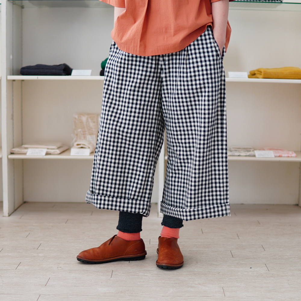 合わせたパンツはフロントに大きなタックがはいったワイドパンツ。程よい大きさの黒と白のギンガムチェックは、女子の心をくすぐる永遠のトキメキパターンですね。