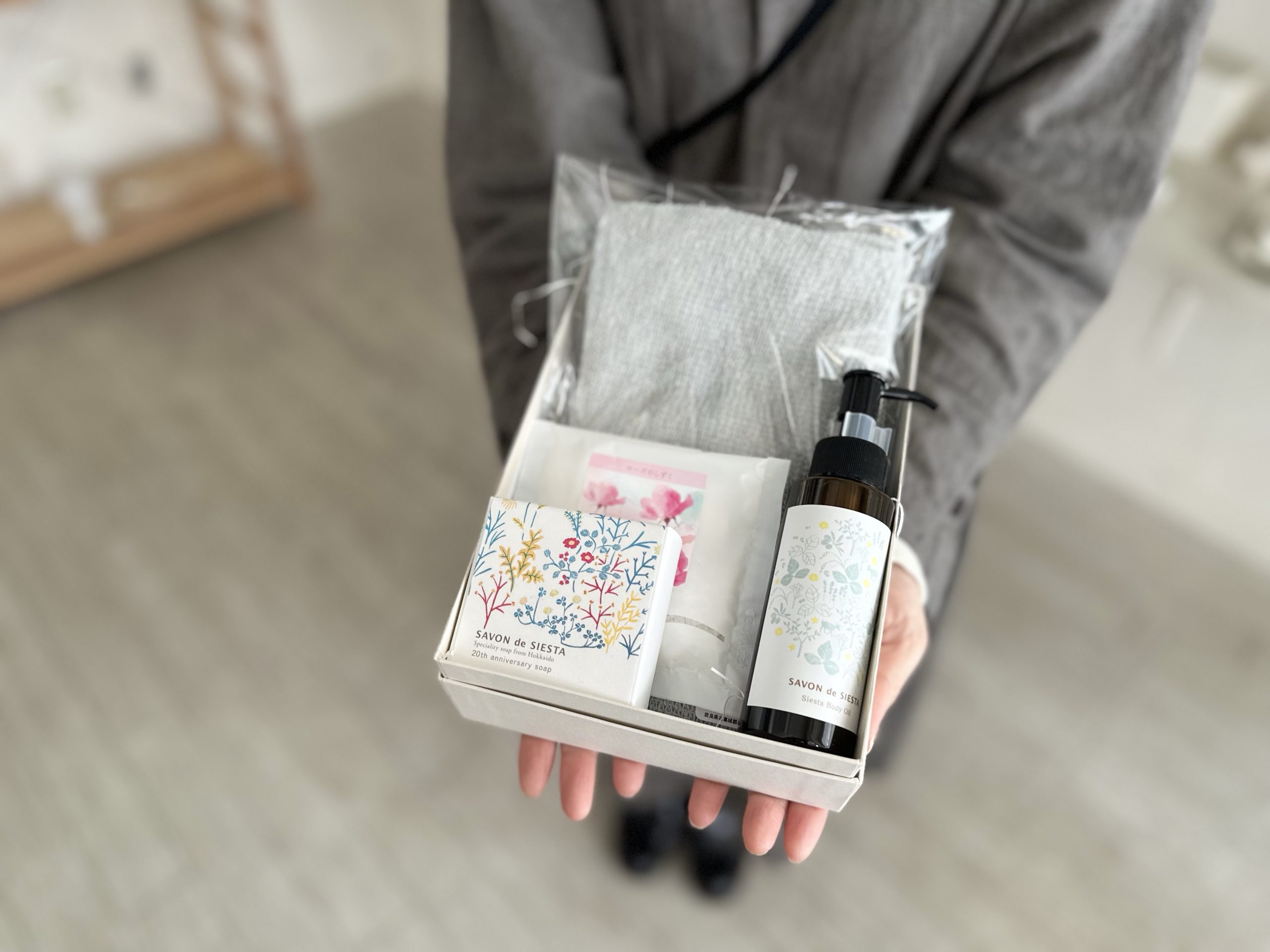 今年のプレゼントは、手にしてくださった方がご自宅に戻ってからのひと時を心地よく過ごしていただくシーンを想像しながら選びました。バスタイムに使っていただきたいのは石鹸とバスソルト。