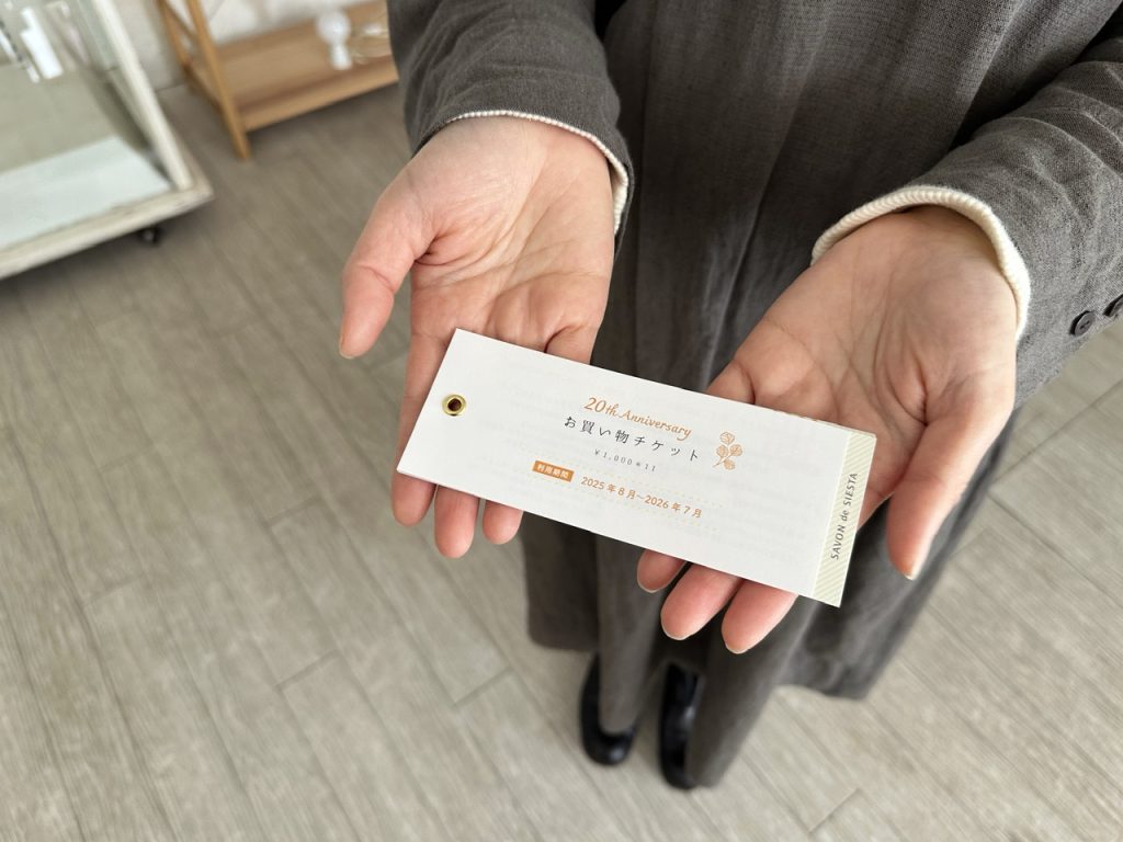 シエスタ創業20周年を記念して作られた「お買い物券」。1000円チケットが11枚つづりで10000円で買えるかなりお得なチケットです。(お買い物チケットについての詳細は、後日ブログでご紹介いたします。)