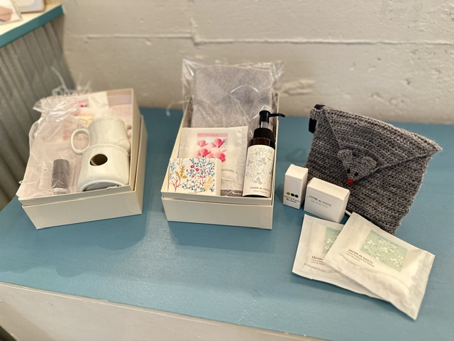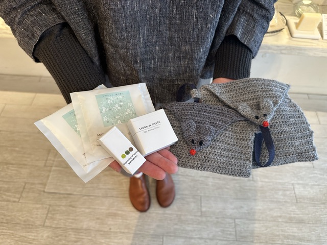 これらのアイテムがねずみのポーチに入っております。今回のために手作りしました(この冬、編み物にドはまり中)!どうぞ使って下さいね。