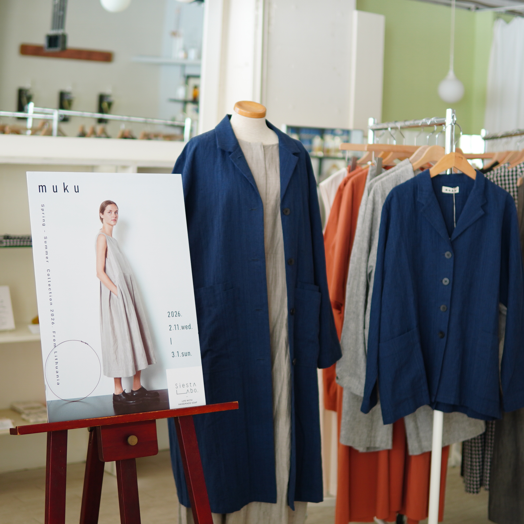 直営店では、3月1日(日)まで「muku春夏展」を開催中です。1週目は事前にlookbookでコレクションをチェックしてくださったお客様が、実際のお洋服を見にたくさんご来店くださいました。本当にありがとうございます。