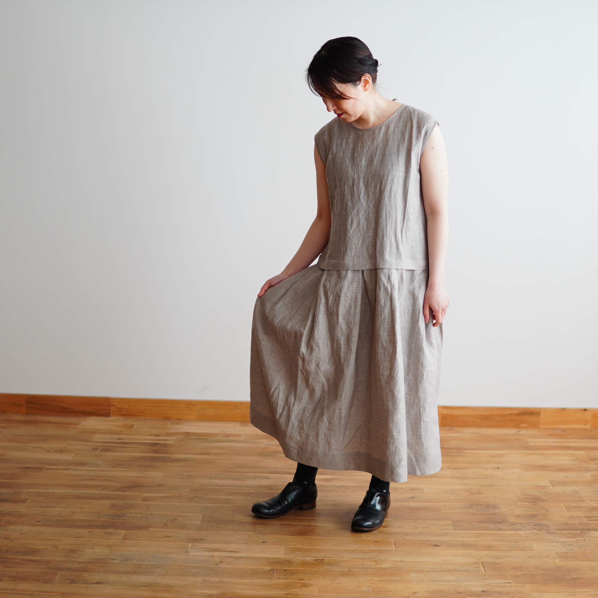 このドレスを着ていると、よく褒めていただきます。他にはないデザインが目を惹くのかもしれません。彩子さんやお客様が着ている姿を見るたびに、やっぱり素敵だなぁと見入ってしまいます。着る人それぞれに自然となじみ、その人らしく育っていく。そんな力のあるドレスだと感じています。