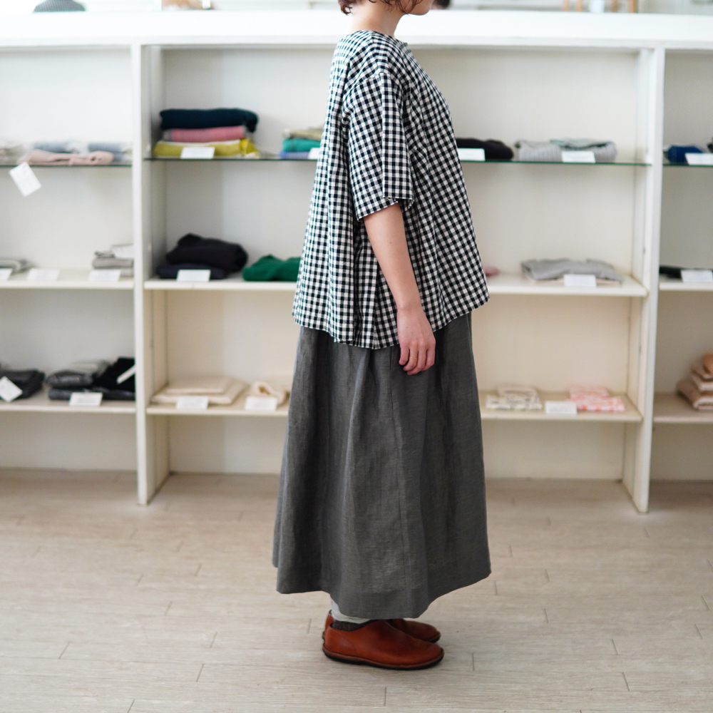 リネン素材は、さらに軽やかさがでます。後ろ下がりのサイドシルエットもとってもきれいですよね。リネンならではの光沢感と落ち感がとってもすてきです。