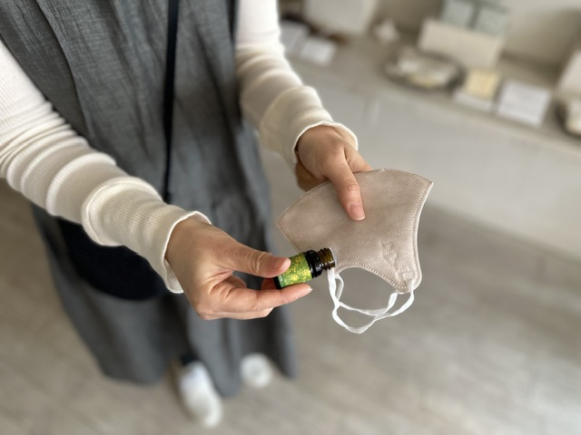 マスクの外側(注意:お肌に直接触れない部分)に精油を1滴垂らして使うのもオススメで、すっきりした清涼感のある香りで呼吸や鼻づまりがスーッとラクになります。ぜひお試しください。