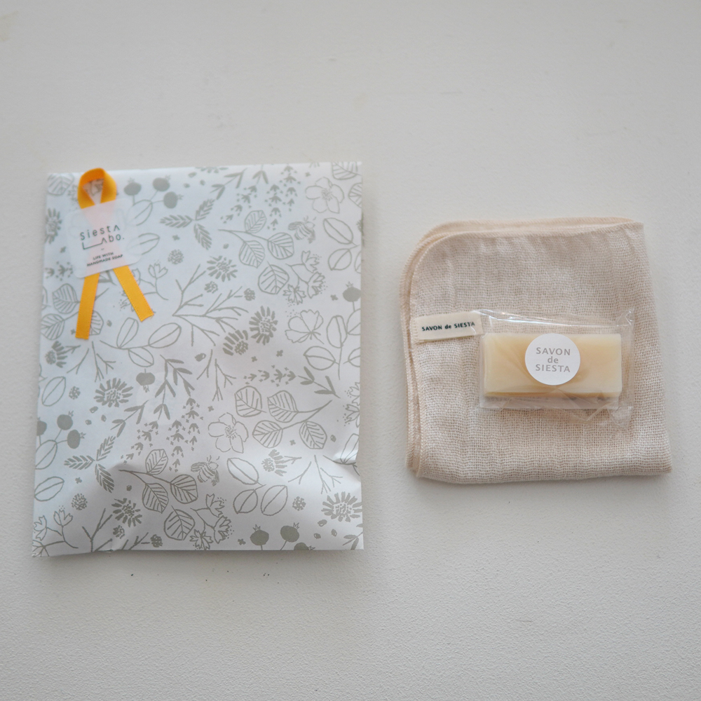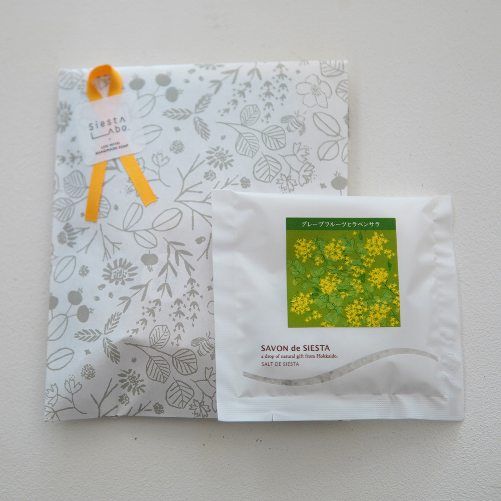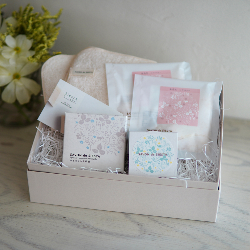 石鹸とバスソルトのセットは全部で3種類。左から、しっとり肌セット(バスソルト花の香り+やぎのミルク石鹸)、さっぱり肌セット(バスソルト森の香り+あずき石鹸)、敏感肌セット(バスシュガー+プレーン石鹸)の肌悩み別でご用意しています。シエスタの定番アイテムが楽しめるセットなので、シエスタのアイテムを初めて手にする方にもオススメです。