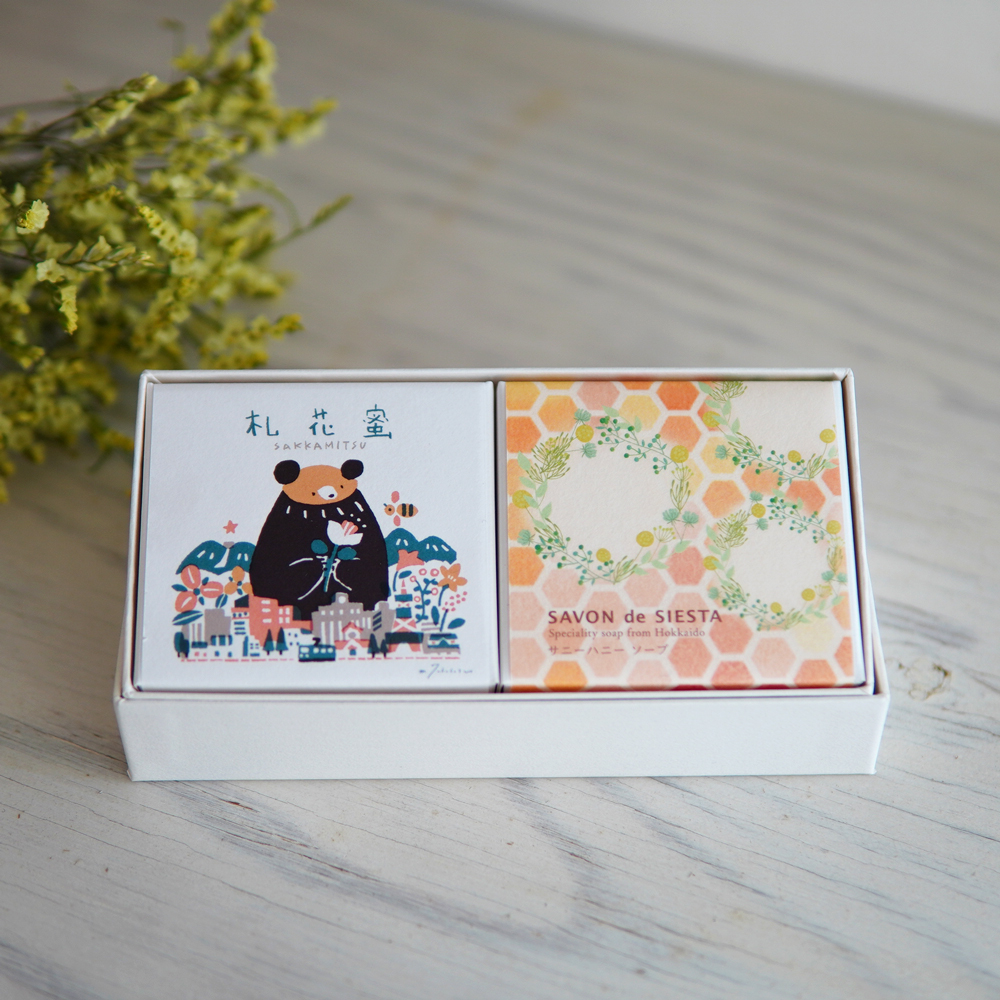 石鹸2個がちょうどぴったり箱に入ったギフトBOXもオススメです。今回選んだのははちみつとメープルシロップ配合の「サニーハニー石鹸」と直営店限定「札花蜜石鹸」。どちらもはちみつが入っていてしっとり潤います。くまのパッケージもとってもかわいいので、箱を開けた瞬間、うれしい気持ちになること間違いなしです!