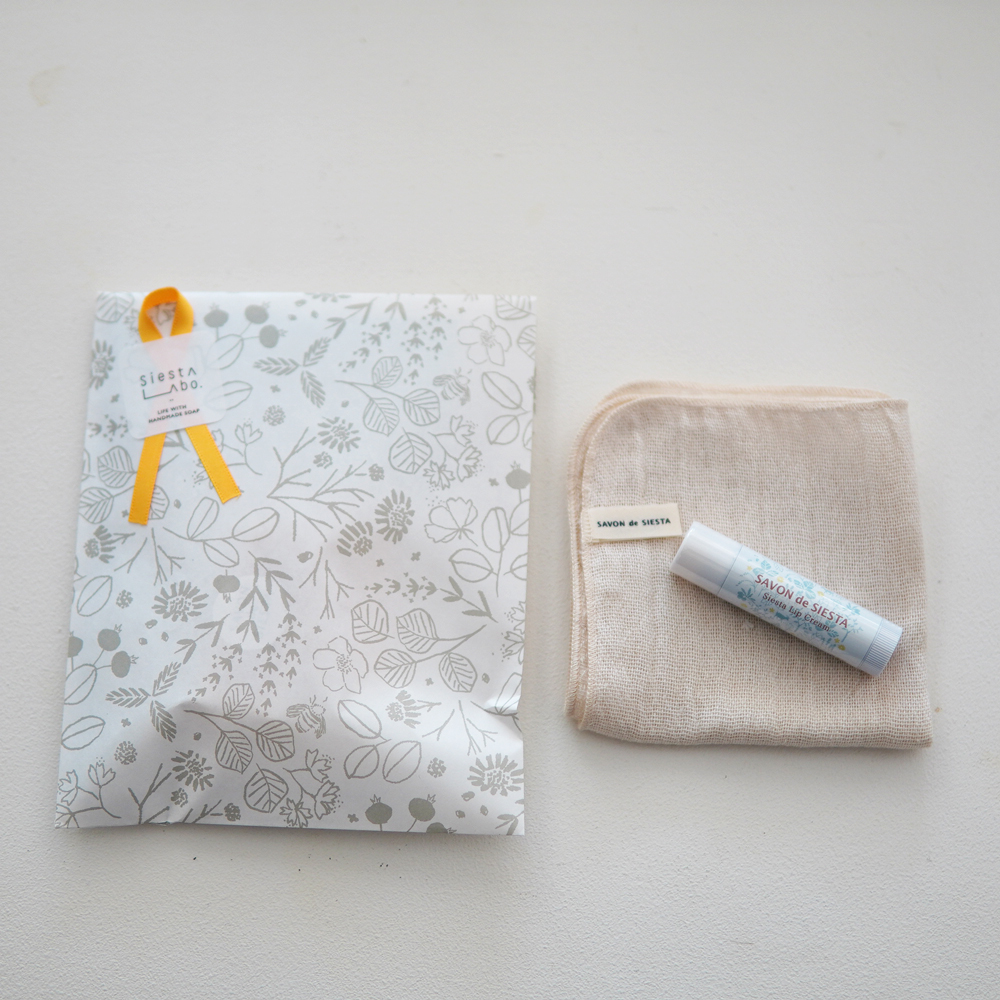おでかけの必需品をセットで贈ることができる「リップクリーム」と「リネンハンカチ」のセットはいかがですか?
