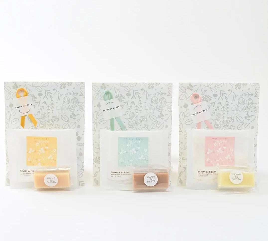石鹸とバスソルトのセットは全部で3種類。左から、しっとり肌セット(バスソルト花の香り+やぎのミルク石鹸)、さっぱり肌セット(バスソルト森の香り+あずき石鹸)、敏感肌セット(バスシュガー+プレーン石鹸)の肌悩み別でご用意しています。シエスタの定番アイテムが楽しめるセットなので、シエスタのアイテムを初めて手にする方にもオススメです。