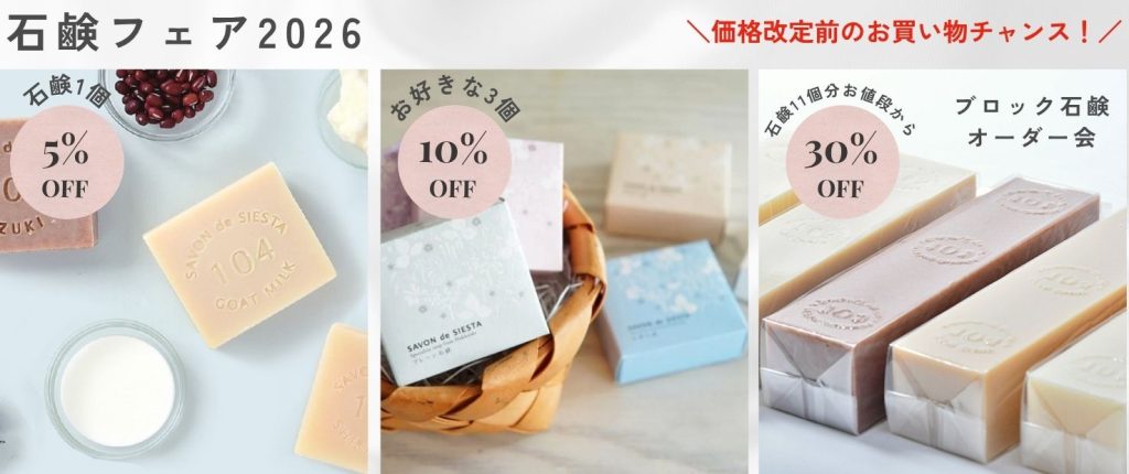 「石鹸フェア」は、オンラインショップと直営店で4月末まで開催中です!
