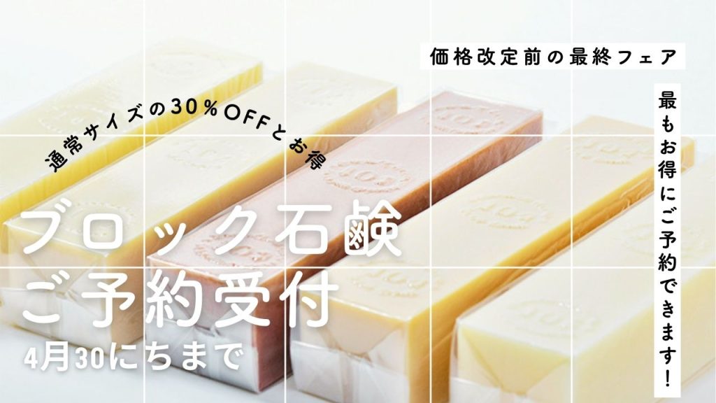 既にご案内させていただいた通り、大変恐縮ながらブロック石鹸はじめとする定番石鹸の種類と価格改定を6月に予定しております。また、現行のプレーン石鹸と白樺石鹸は、5月末をもって販売終了となります。