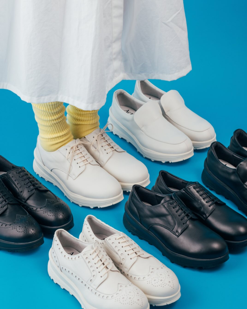 板倉さん、前田さんにすすめられるままに履いたのが、アクティブトラベルシューズシリーズの中の一足。足を入れた瞬間の安定感。地面を、きちんと踏みしめているという感覚。そして、あれほどつらかった腰の痛みが、すっとやわらいだこと。「靴ひとつで、体はこんなにも変わるのだ」と、静かに驚きました。楽なだけではなく、革仕立ての佇まいはすっきりとしていて、大人のスニーカーと呼びたくなる一足。普段の装いにも自然になじみ、長く付き合っていけそうだと感じました。